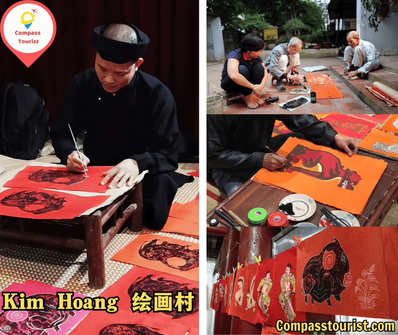 Kim Hoang的画作通常印在木板上,然后工匠们会直接在红色或粉色的纸上手工涂色——这是此类绘画的一个显著特征,也是其“标志”。因此,每幅画都是独一无二的,没有两幅完全相同。热门主题包括鸡、猪、新年祝福或描绘乡村风俗的画作。随着时间的推移,由于洪水和战争破坏了几乎所有古代木版画,Kim Hoang 画派一度衰落。然而,由于工匠和研究人员的奉献,金黄画作近年来得到了修复,逐渐回归文化生活,成为文景人民的骄傲。