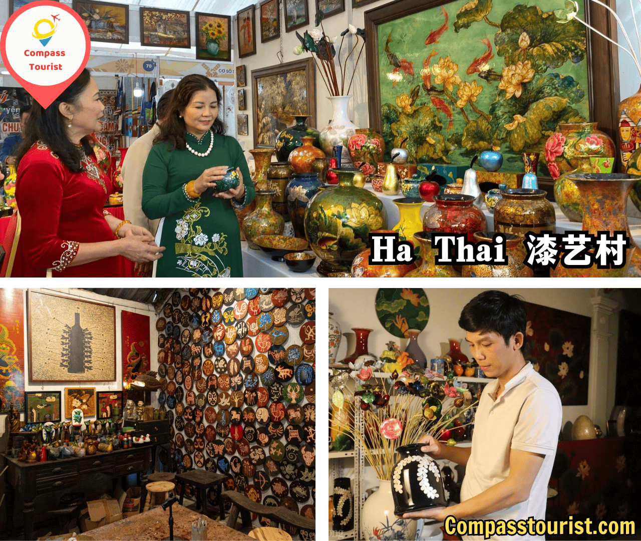 在参观河内Ha Thai漆画村的过程中,我深受这里精湛的工艺和富有艺术气息的氛围所打动。走进村里,映入眼帘的是一个个忙碌的作坊,艺人们正专注地打磨、上漆、贴金,每一道工序都格外细致。最有趣的是观看完整的传统漆艺制作流程——从做骨架、上漆、多层打磨,到螺钿镶嵌与最终的高光抛亮,每一步都展现出下泰工匠的耐心与技艺。无论是小小的漆盒、挂画,还是装饰花瓶,每件作品都凝聚了艺术创意与传统精神。参观Ha Thai漆画村,不仅是欣赏工艺之美,更是一次触碰河内传统手工文化、感受其在现代中延续与发展的旅程。